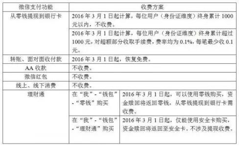 自2016年3月1日起,微信支付对累计超出1000元额度的提现交易收取手续费,超出部分按银行费率收取手续费(目前费率均为0.1%),每笔最少收0.1元。同日起,转账功能停止收取手续费。