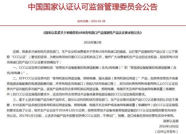 也就是说,自2017年1月1日起,带有USB充电接口的插线板、台灯等产品应该在2016年12月31日前取得USB充电接口部分的CCC认证才能出厂销售。