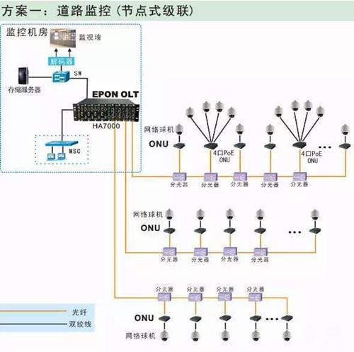 周边道路的监控完全可以采用一字形的布纤方式,将道路监控点串联起来。在小型的区域环境下,有效长度达20KM的EPON完全可以提供接入,在大型的区域中,可以使用多条线路接力的方式解决距离问题。