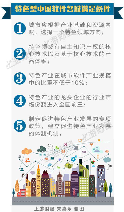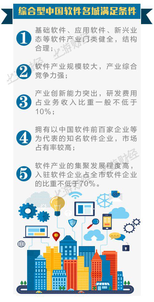 具体来看,认证方式分为两类,一类是综合型中国软件名城,一类是特色型中国软件名城,综合型中国软件名城的数量原则上不超过10家。对通过相应实地评估标准的两类中国软件名城,每两年进行一次动态评估。当某个特色型中国软件名城的产业规模指标超过了某个综合型中国软件名城时,实现“晋级”,后者则面临“退级”。还将通过发文的方式确定当期内各城市的中国软件名城级次。两类中国软件名城分别应该满足的条件如下: