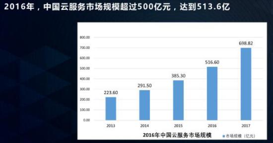 《中国云服务及云存储市场分析报告》也指出,2016年云服务市场规模达到516亿。预计2017年市场份额将达到698亿。而在近三年来,年复合增长率已超过了32%。