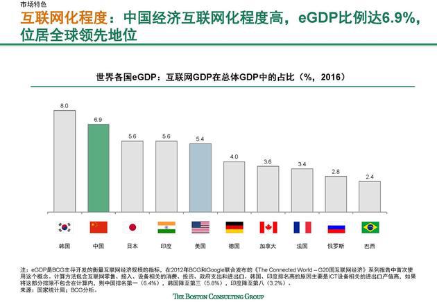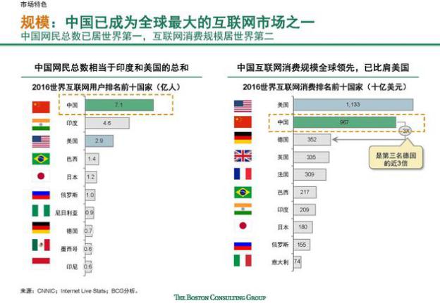 报告显示,至2016年,中国已拥有7.1亿网民,目前已经成为全球最大的互联网市场之一。而中国互联网消费以9670亿美元规模仅次于美国成为全球第二,是第三名德国近三倍。同时,中国互联网GDP在总体GDP中的占比达到了6.9%,高出美国的5.4%,处于世界领先。
