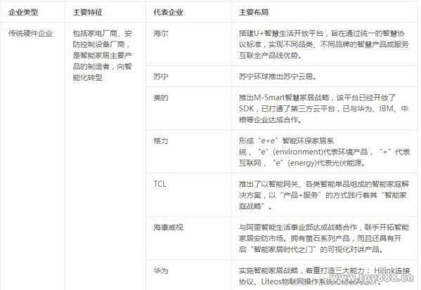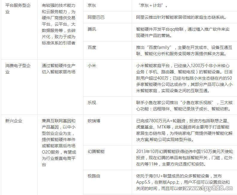 从企业层面来说,传统家电巨头海尔、美的、格力等,均积极布局,开发智能产品,同时寻求与互联网企业的跨界合作,从单体竞争逐渐转变为生态系统竞争。海尔与微软、魅族,美的与华为、小米、阿里等,均已达成战略合作,在资本、生态链、移动互联网等领域探索合作路径。同时,一些新兴创业公司兴起,多瞄准智能家电、智能插座、路由上网设备、照明系统、娱乐设备、健康健身设备、安防系统等单品进入市场,不过这些企业实力较弱,很多仅是昙花一现。