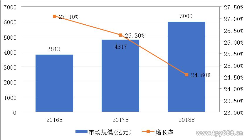 数据显示,2016年中国智能家居市场整体规模预计将达3813亿元,同比增长27.1%,2018年有望达到6000亿元,三年间市场规模年复合增长率为25.9%(见图表4-12)。