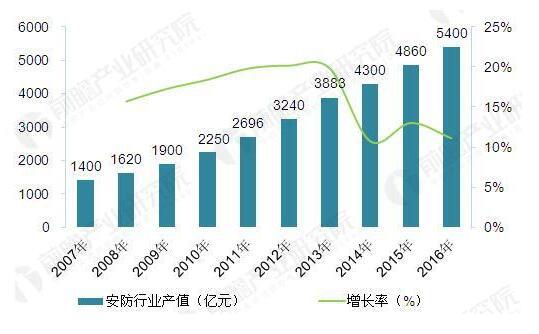 图表1:2007-2016年我国安防行业产值及其增长情况