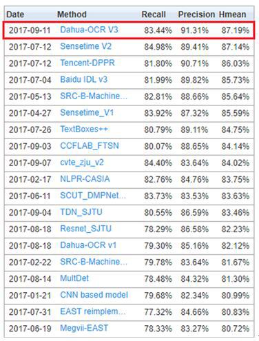 大华股份先进技术研究院,采用深度学习技术研发的文本检测技术,在国际竞赛中取得了自然场景随手拍文本检测排行榜第一名,标志着大华股份在自然场景文字检测方面取得了突破性进展,为技术成果落地奠定了坚实的基础。