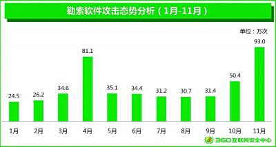 报告显示,2017年1~11月,360互联网安全中心共截获电脑端新增勒索软件变种183种。全国至少有472.5万台电脑遭到了勒索软件攻击,平均每天约有1.4万台国内电脑遭到勒索软件攻击。