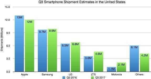如上图的数据显示,2017 年第三季度,苹果在美国手机市场占据领先地位,而二三名的三星和 LG 也都不是“便宜货”。这里不像是小米耕耘的印度,美国消费者有意愿和经济实力去购买售价更高的旗舰手机。