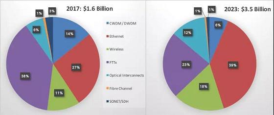 到2023年,中国市场光收发模块的市场规模会从2017年的16亿美元增长到35亿美元。中国的以太网光模块的消费量预计在2018年到2023年期间将迅速成长。如下图所示,它将占到所有光模块销售额的最大份额,从2017年的27%增长到39%。光互连的需求,如有源光缆(AOC),预计也将保持很强的态势,从2017年的6%增长到12%。无线领域的光模块的市场占比也将增长到18%。